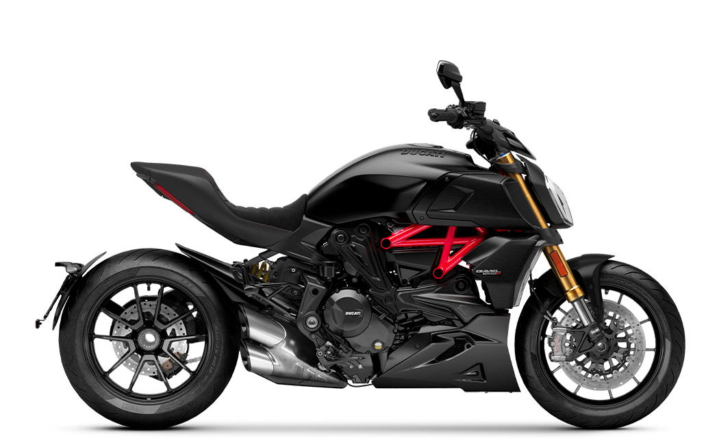 The Diavel 1260 S “Black and Steel” joins the S version in Thrilling Black & Dark Stealth colour with red frame and black wheels. The standard version is available in Dark Stealth colour with black frame and black wheels.